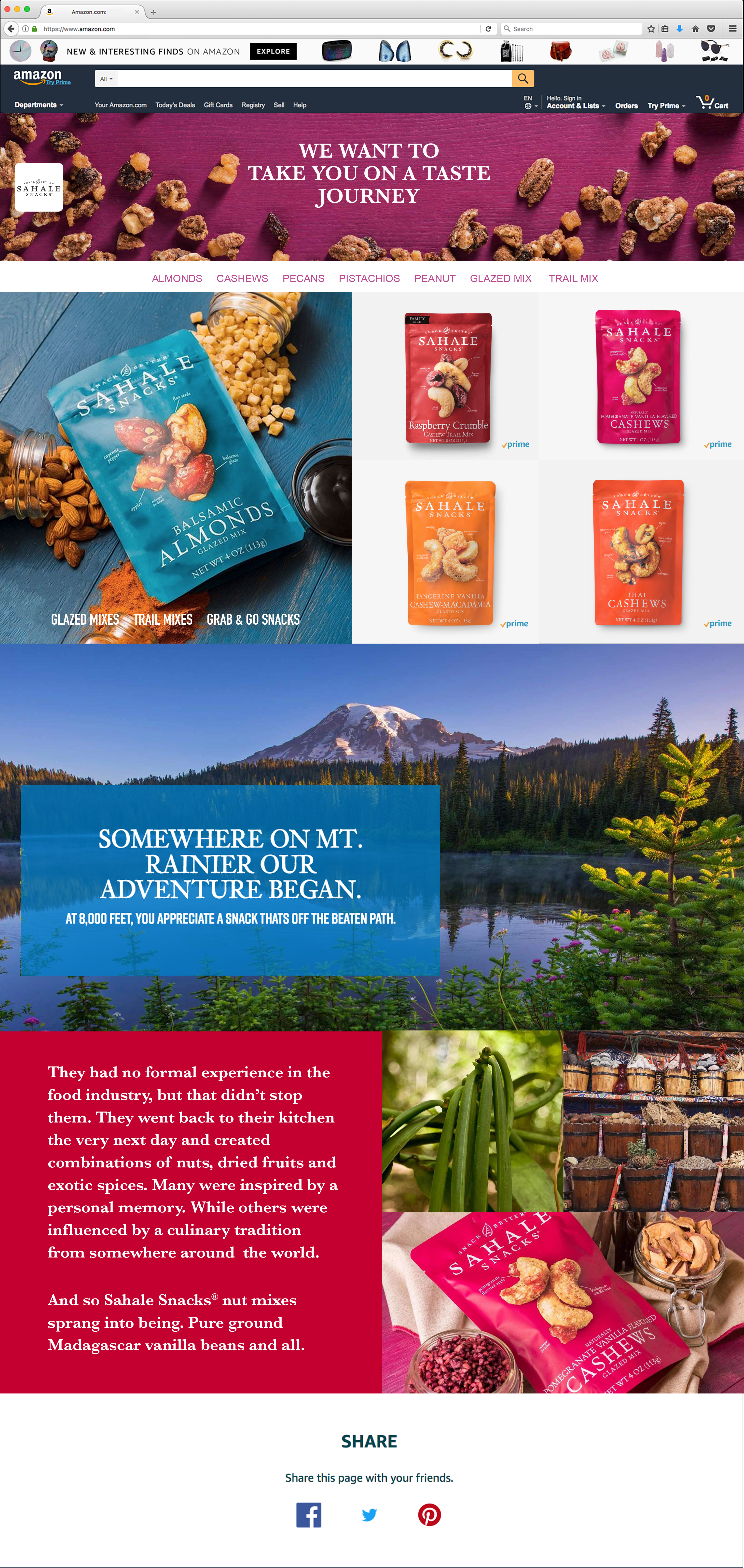 Develop Amazon store page for Sahale Snacks. Create landing page and template for Amazon store.